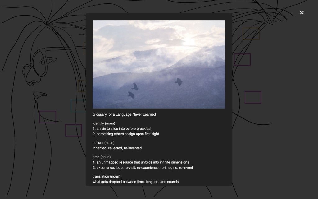 “This is amazing! I love how it’s a map and non-linear and that it shifts around with every visit, creating the unexpected. And somehow that does reflect how things are and how memory is, that they shift around with every visit and are never exactly the same…I liked the poems and writing best especially the Glossary for a Language Never Learned.”